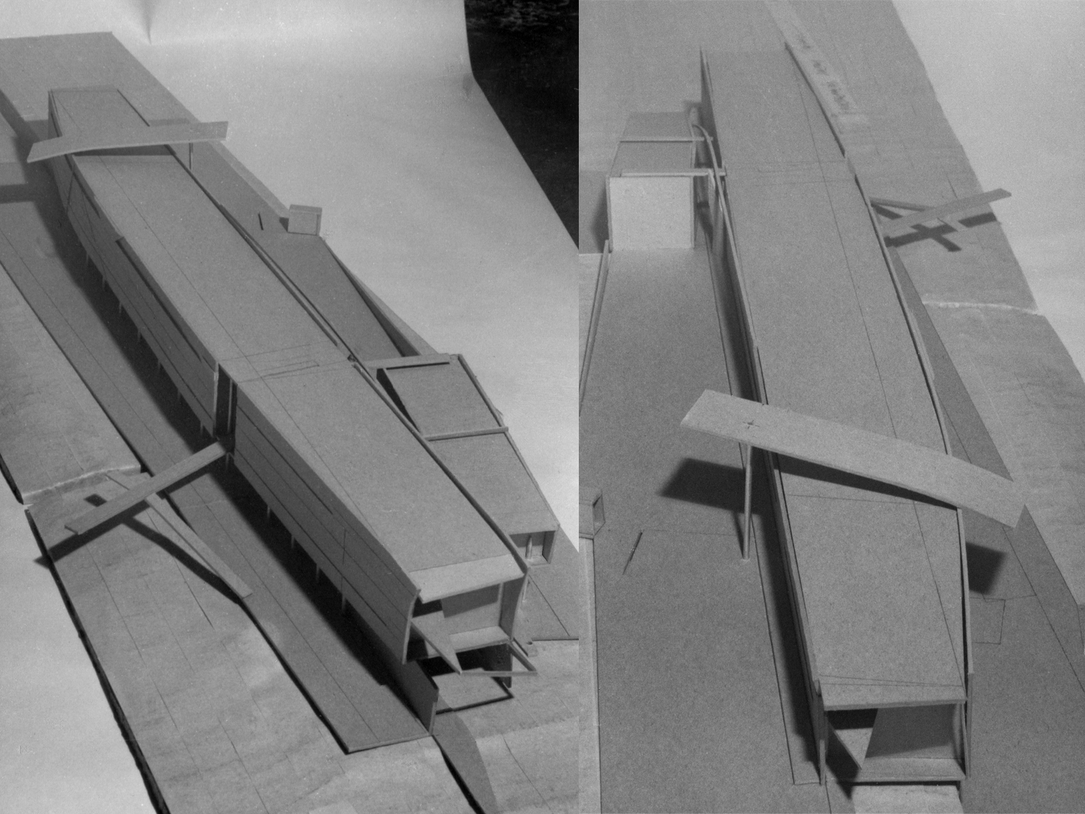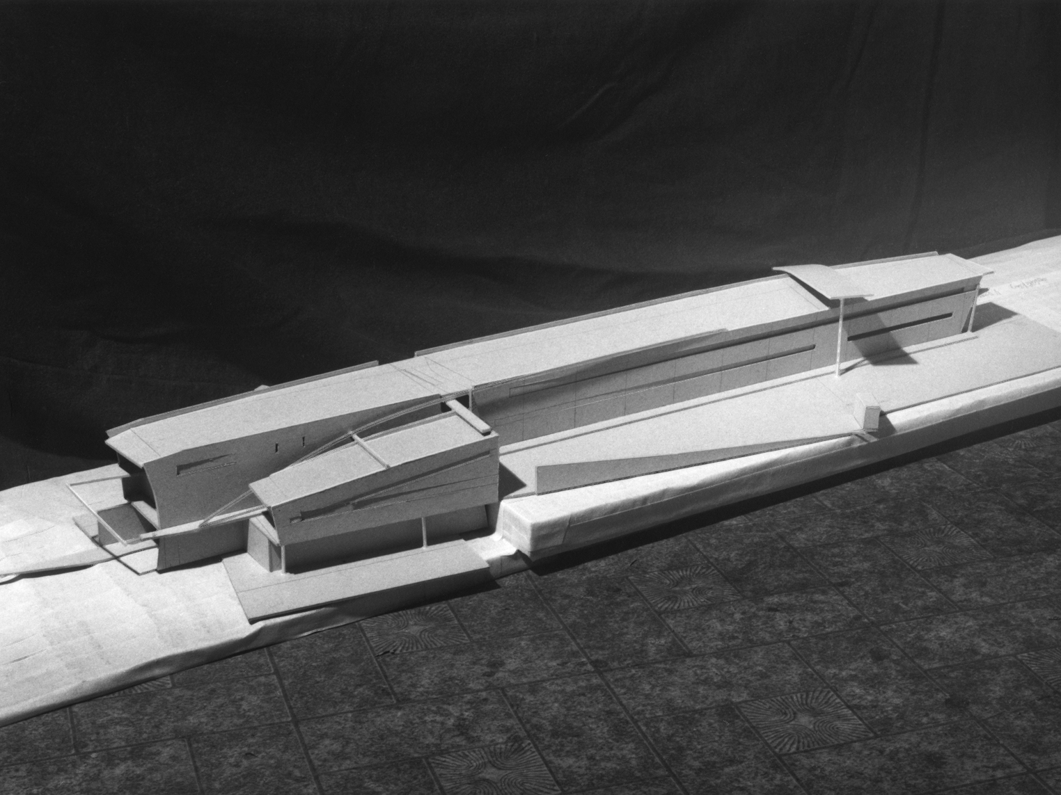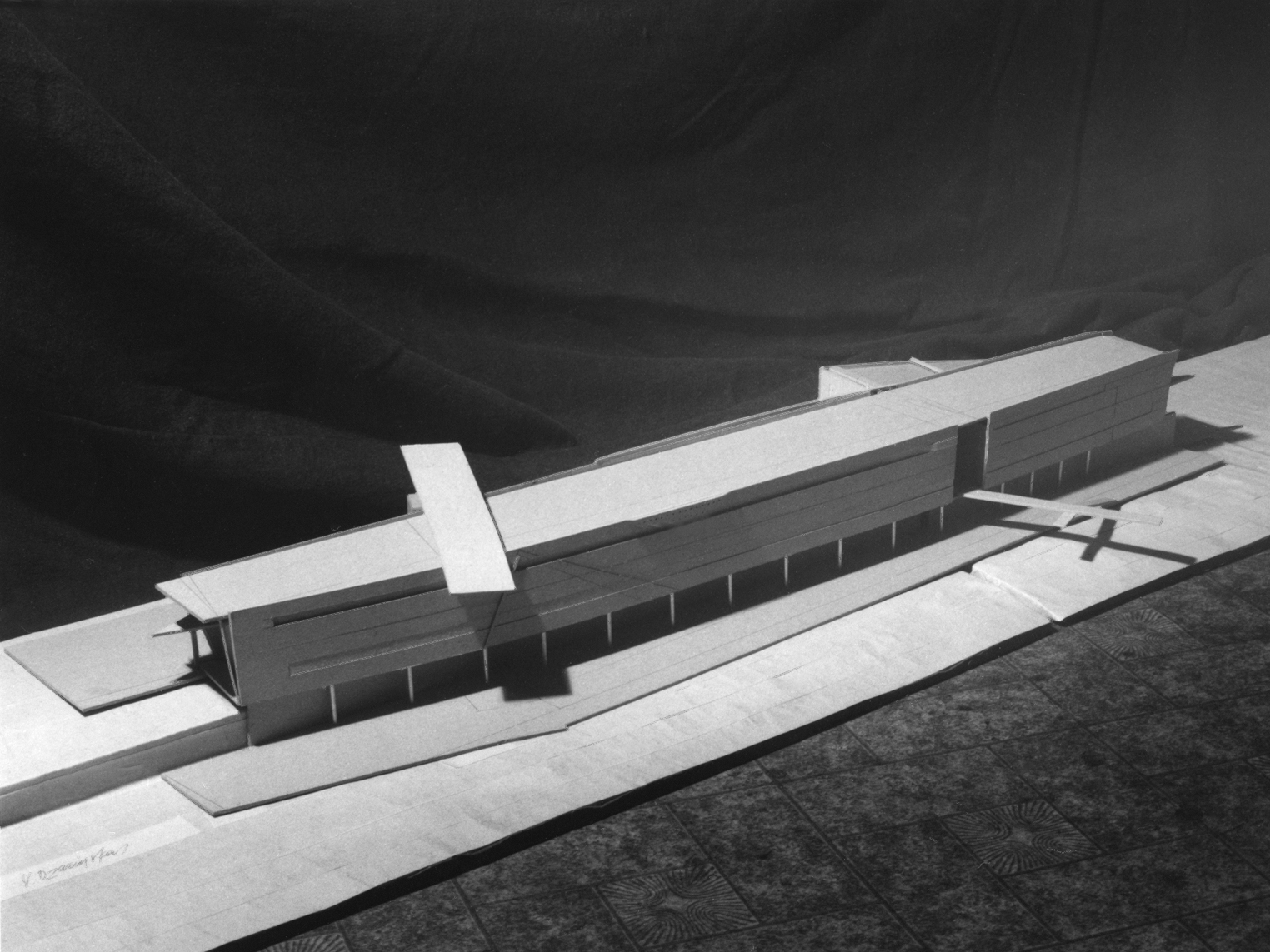 Apibendrintas maketo siluetas iš pirmo žvilgsnio sufleruoja statinį, galintį darniai įsilieti į modernistine maniera suprojektuotų administracinių pastatų plejadą. Visgi detalės išduoda kitokią intenciją. Racionalų, ant atramų pakeltą korpuso tūrį kerta kelios kontrastingos, tarsi įstrižai „įsmigusios“ plokštumos, destabilizuojančios kompozicijos simetriją. Kompozicijoje užkoduotą įtampą dar labiau sustiprina sudėtingas horizontalių linijų ritmas ir tūrio suskulptūrinimas, keliantis asociacijas su gigantišku pramoniniu objektu ar traukinių stotimi.